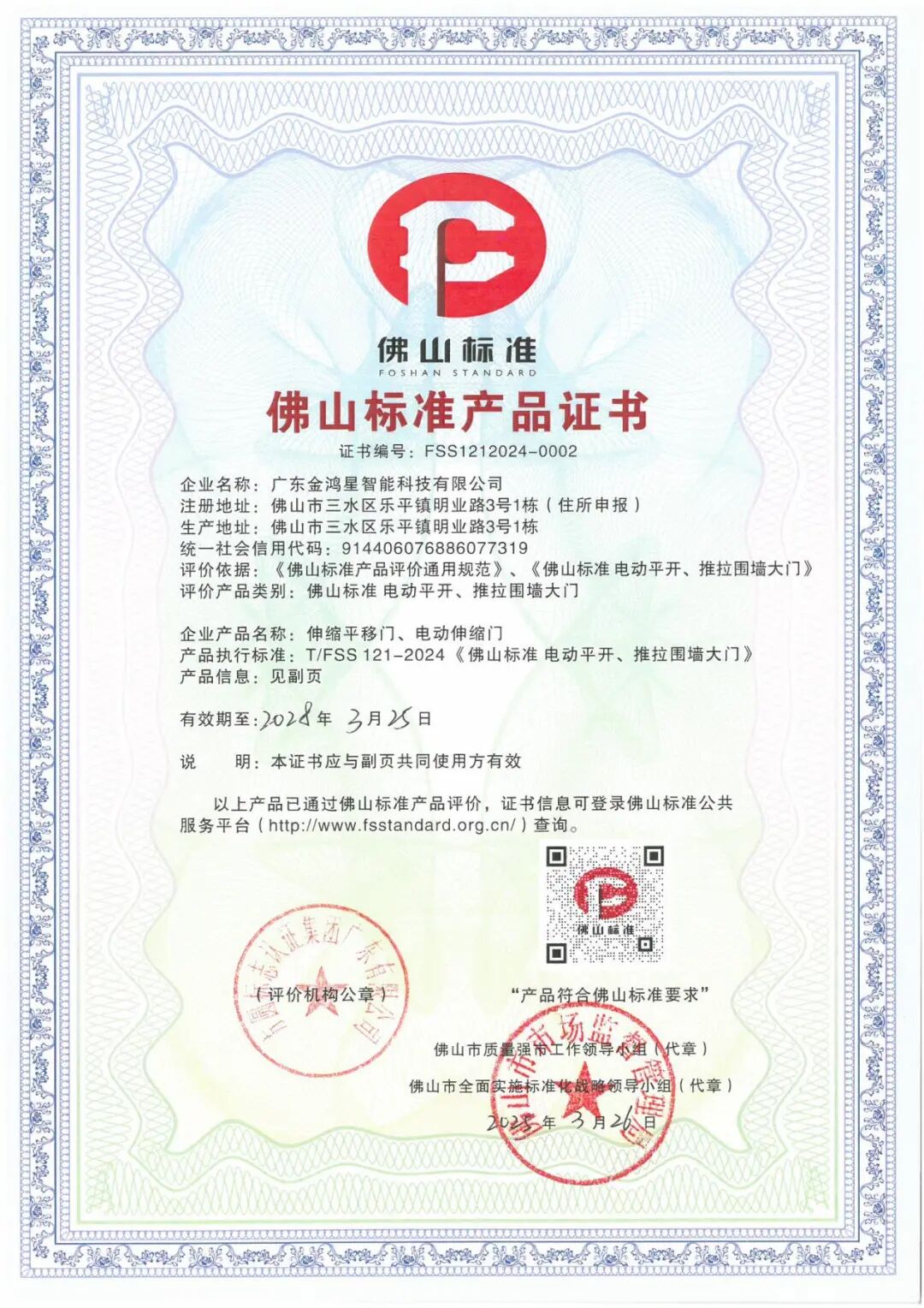作为佛山本土企业,金鸿星智能科技始终聚焦智能门控领域,其生产基地坐落于佛山市三水区乐平镇,拥有完整的研发、生产、服务体系。此次认证不仅是对企业实力的认可,更彰显了“佛山制造”向“佛山智造”升级的成果。