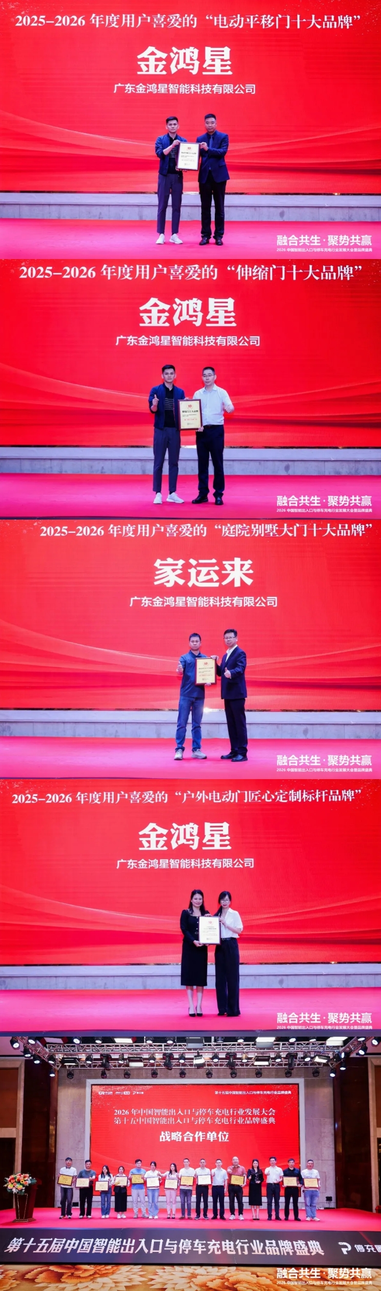 在备受关注的颁奖环节,金鸿星凭借深厚的技术积累、严苛的匠心品质与完善的终端服务体系,一举斩获“电动平移门十大品牌”“伸缩门十大品牌”“庭院别墅门十大品牌”及“户外电动门匠心定制标杆品牌”四项荣誉。同时,企业获评行业“战略合作单位”号,这既是对金鸿星综合实力的权威认可,也是对其行业责任与品牌担当的充分肯定。
